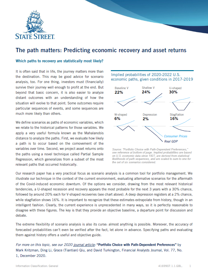By Mark Kritzman, Ding Li, Grace (Tiantian) Qiu, and David Turkington.   Published in the Financial Analysts Journal, December 2020.   We show why mapping sequences of economic outcomes leads to a richer understanding of scenarios, probabilities and portfolio returns.   Conventional methods of scenario analysis are often oversimplified, focusing only on outcomes and ignoring what happens along the way. We propose that investors define scenarios as paths of economic variables, which are compared ...