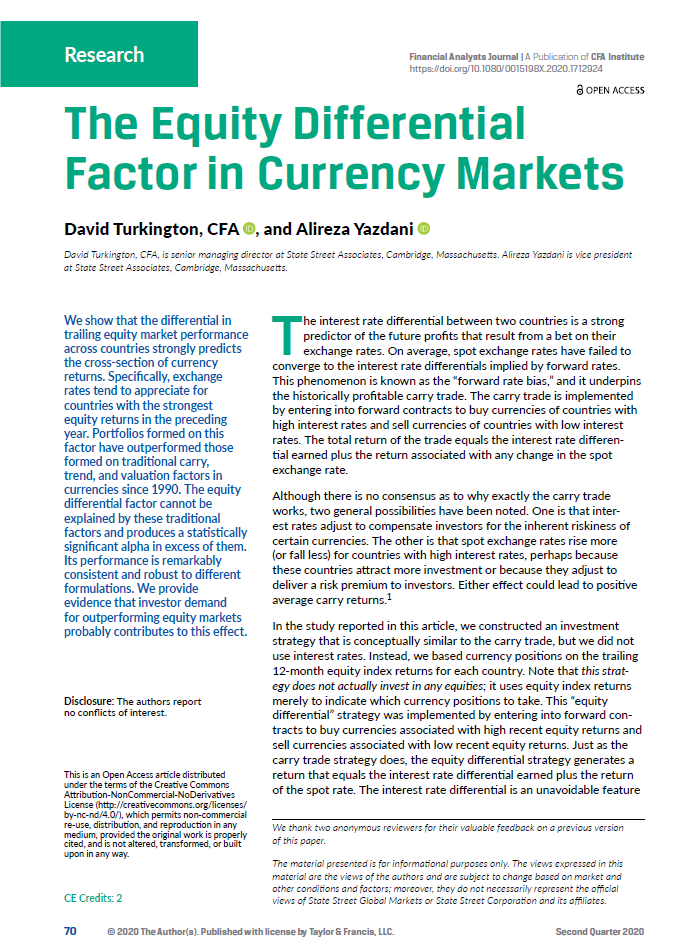 By David Turkington and Alireza Yazdani. Published in the Financial Analysts Journal, March 2020. Currencies tend to appreciate after their local equity market has done well, and a diversified strategy formed on this simple rule outperforms the traditional FX carry, value and momentum strategies. What is the relationship between a country’s currency and the performance of its stock market? Conventional wisdom suggests that only weak links exist between the two, but we find otherwise. It turns out ...