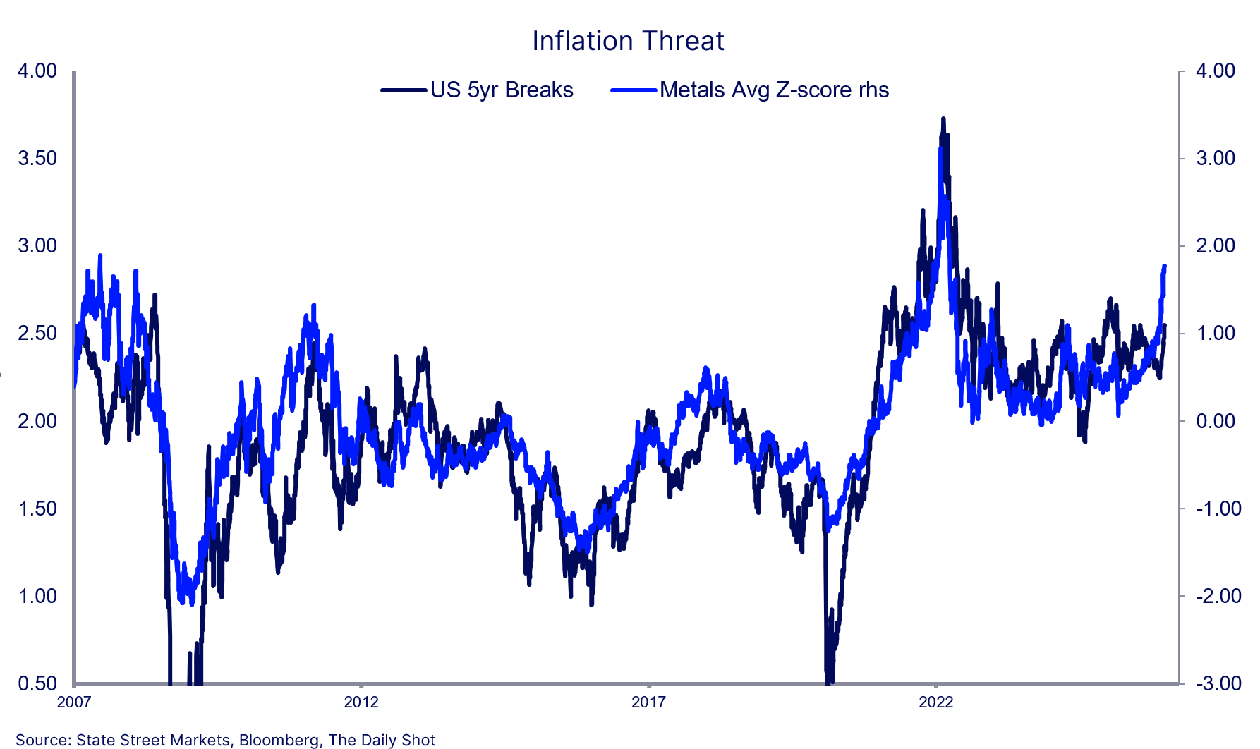 Chair Powell characterized the current inflation situation as being distorted by the inflationary impact of new tariffs, while expressing confidence that the Fed will bring inflation back to the 2% goal. It may be the case of Lucy pulling the football away.  The graph shows the average z-score of copper, aluminium, lead, tin and nickel.  Based on a long history, the surging z-score suggests upside risk to US 5-year breakeven rates. There is an old adage that states when the Fed becomes more complacent ...
