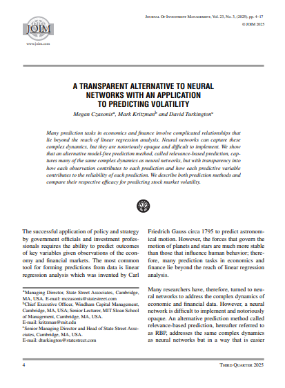 By Megan Czasonis, Mark Kritzman, Fangzhong Liu, and David Turkington   Relevance-Based Prediction can assess a prediction’s reliability from the consistency of the information that forms it, providing a novel perspective that complements conventional measures of confidence.   Prediction is like a voting process. Each datapoint casts a “vote” for the unknown outcome, and the final forecast averages these diverse views. But to know how confident we should be in the average, we need transparency into ...