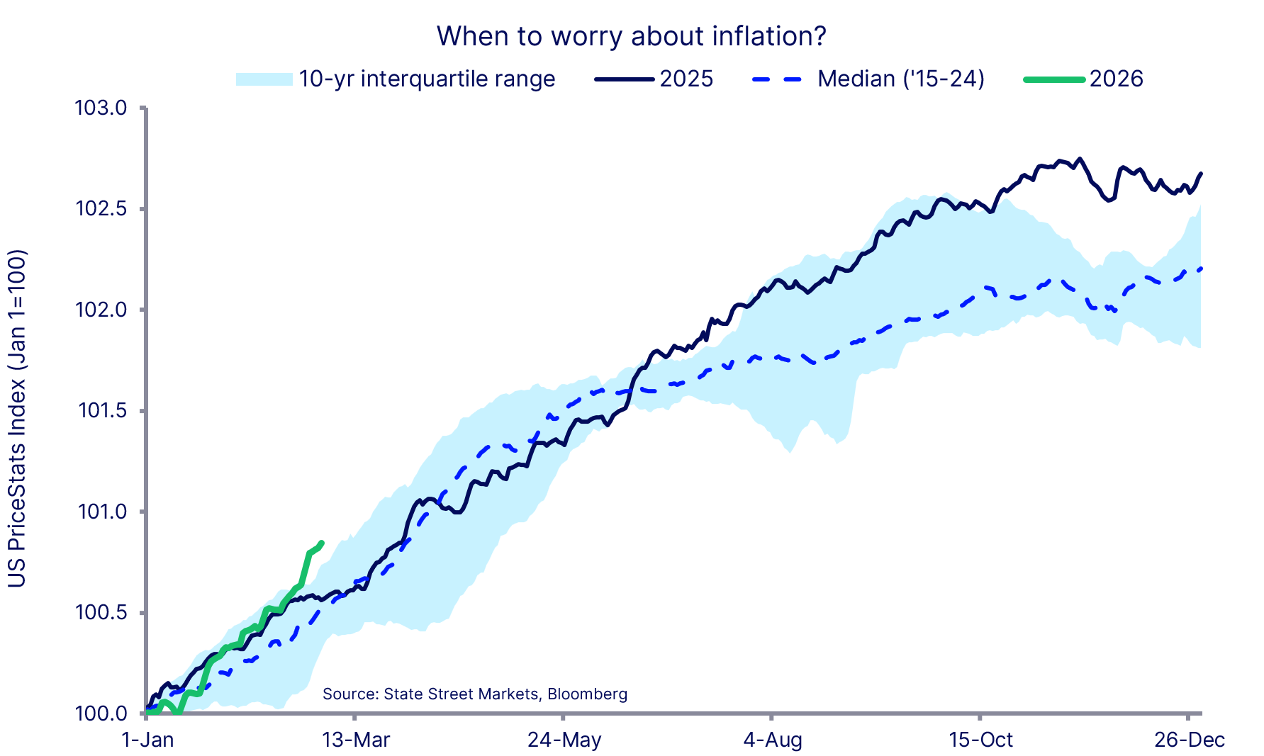 Even prior to the jump in oil prices seen in recent days, our US PriceStats series was sending some slightly worrying messages. Rebasing the series to 100 at the start of the year we see that thus far in 2026, online price rises are running meaningfully above both the 10-yr median and the interquartile 10-yr range. Recent days have also seen the 2026 trend accelerate away from that seen in 2025. It is still early in the year and the annual change in US PriceStats series is a still relatively benign ...